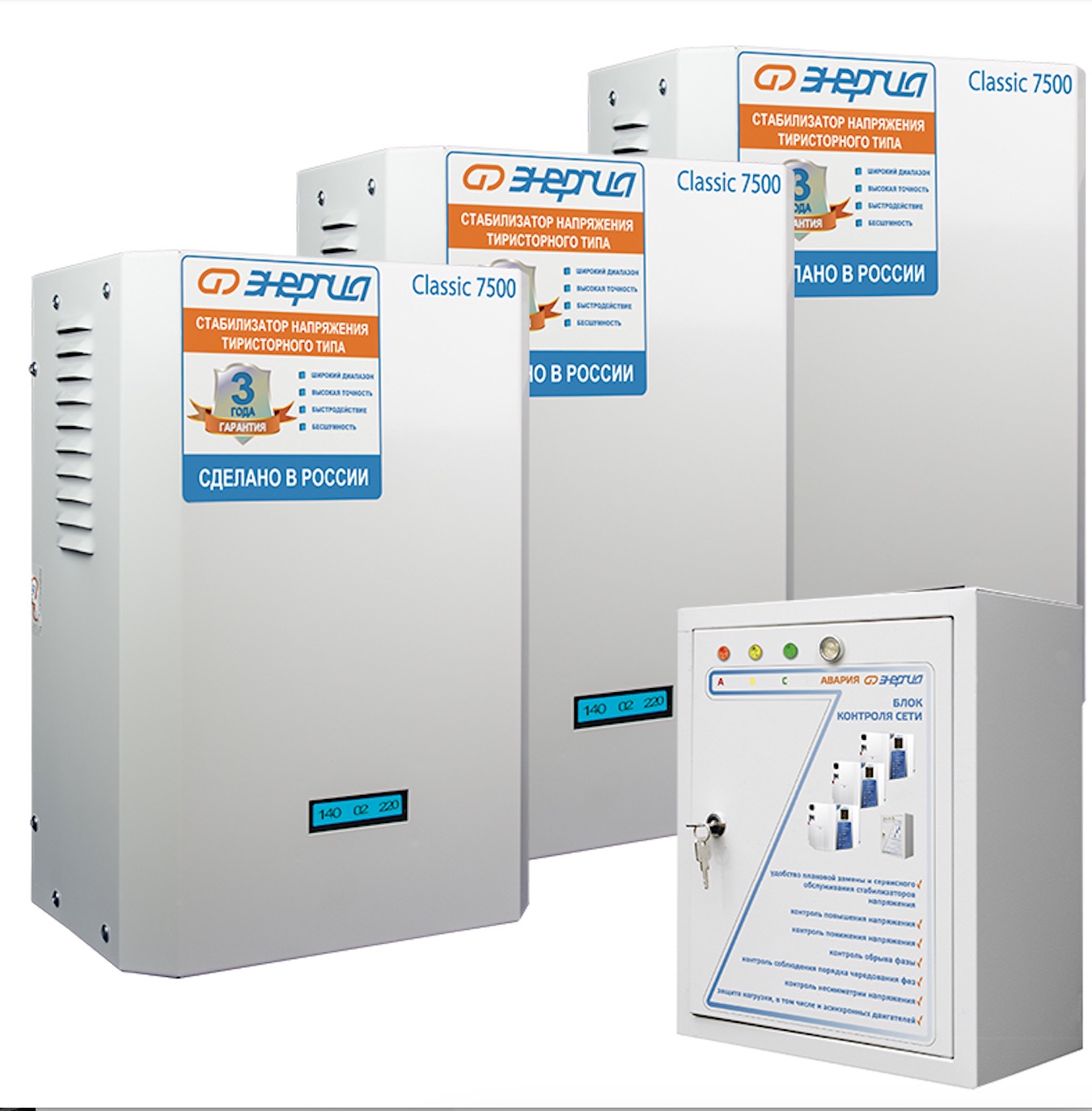 Итог: Однозначного ответа здесь нет. Если в доме есть трёхфазные двигатели или насосы, наиболее надежным решением станет один трёхфазный стабилизатор. В случаях, когда таких потребителей нет или их можно подключить через отдельное устройство, комплект «3 в 1» (три однофазных стабилизатора «Энергия» с БКС «Энергия») окажется более разумным и экономичным вариантом.