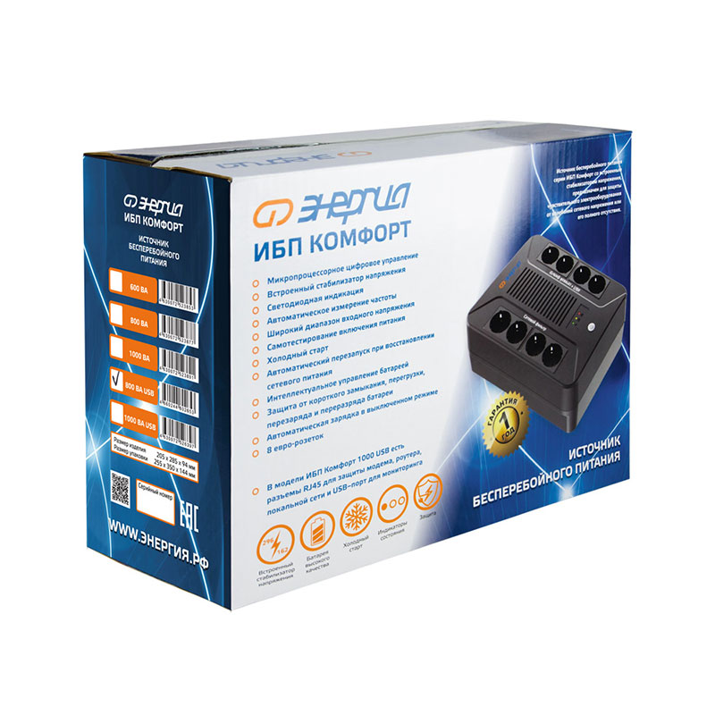 ИБП «Энергия Комфорт» подходит для обеспечения бесперебойной работы вашего домашнего или офисного оборудования: от компьютеров и систем видеонаблюдения до умного дома и платежных терминалов. Простота эксплуатации делает модель идеальной для повседневного использования.
