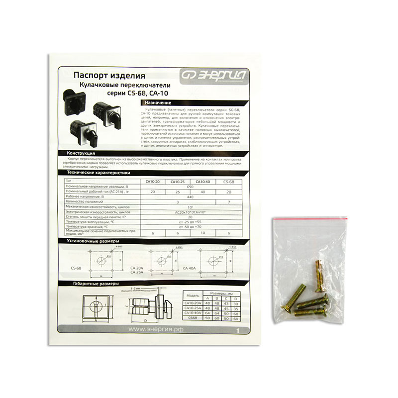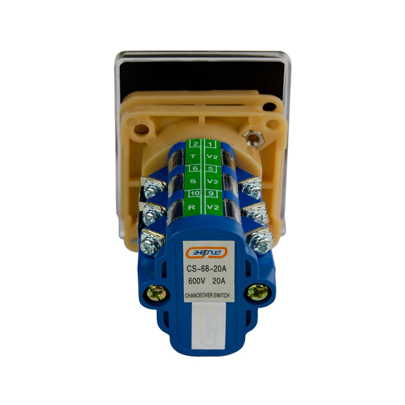 Винтовые зажимы для подключения подводящих проводников обеспечивают их надежную фиксацию. Крепление рукоятки и передней панели к корпусу одним болтом обеспечивает быстрый съем и быстрый монтаж кулачкового переключателя на переднюю панель щитка.