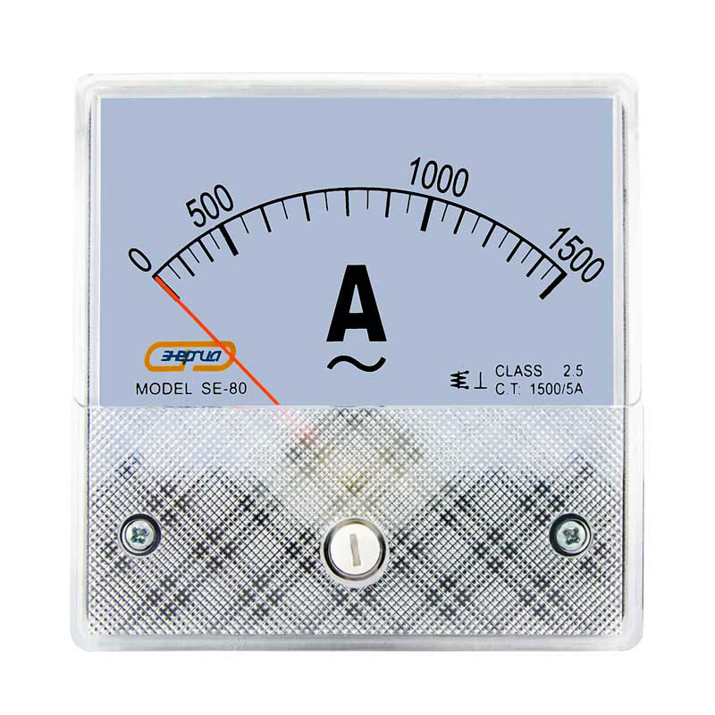 Амперметры серии SE–80 «Энергия» предназначены для измерения силы тока в электрических цепях и подключаются исключительно через трансформатор тока (MSQ) с номинальным вторичным током 5А. Приборы предназначены для измерения переменного тока в промышленных сетях. Класс точности 2.5 определяет допустимую погрешность в 2.5% от максимального значения шкалы. Искажение синусоидальности свыше 1% приводит к дополнительным погрешностям. Установка осуществляется на стандартную щитовую панель размером 80×80 мм.
