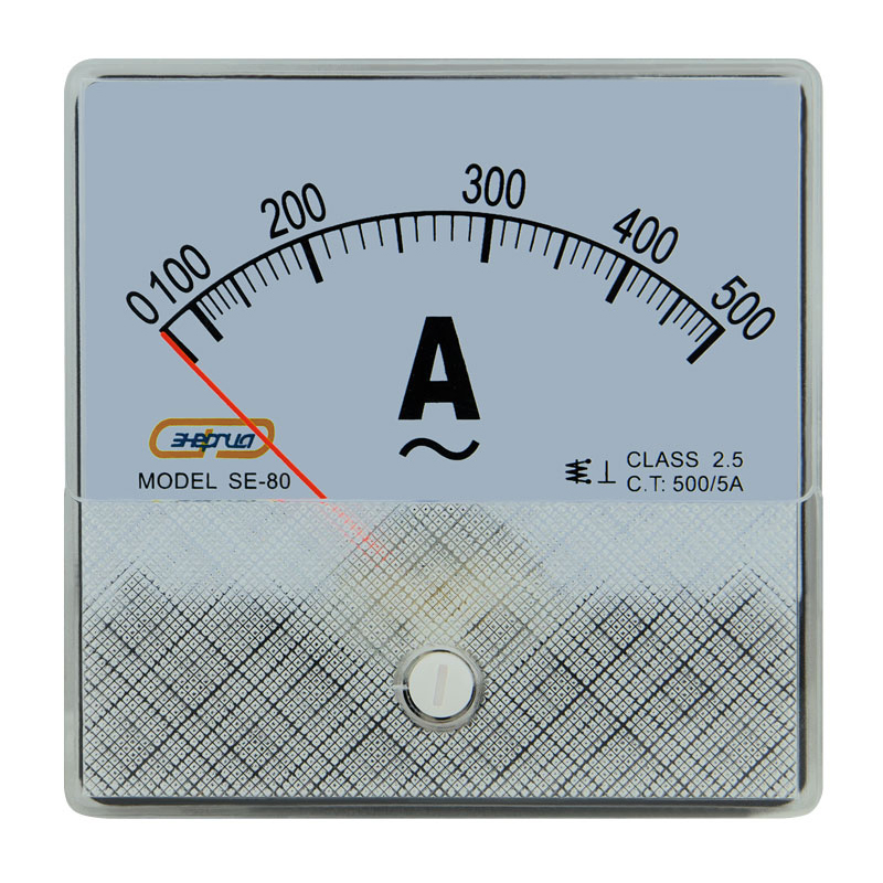 Амперметры серии SE–80 «Энергия» предназначены для измерения силы тока в электрических цепях и подключаются исключительно через трансформатор тока (MSQ) с номинальным вторичным током 5А. Приборы предназначены для измерения переменного тока в промышленных сетях. Класс точности 2.5 определяет допустимую погрешность в 2.5% от максимального значения шкалы. Искажение синусоидальности свыше 1% приводит к дополнительным погрешностям. Установка осуществляется на стандартную щитовую панель размером 80×80 мм.
