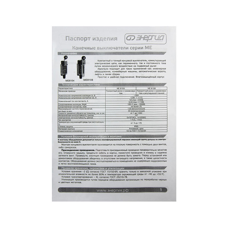 Конечные выключатели Энергия ME предназначены для коммутации электрических цепей управления переменного и постоянного тока под воздействием управляющих упоров в определенных точках пути контролируемого объекта.