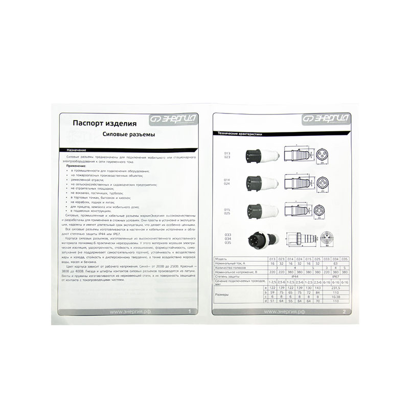 Силовые разъемы «Энергия» предназначены для безопасного подключения промышленного и бытового оборудования к сетям переменного тока. По сути, это усиленные версии стандартных вилок и розеток, рассчитанные на высокие токи, частые подключения и эксплуатацию в неблагоприятной среде. Контактные группы выполняются из латуни, а крепежные элементы и пружины — из нержавеющей стали. Это обеспечивает защиту от коррозии и повышенную безопасность соединения.