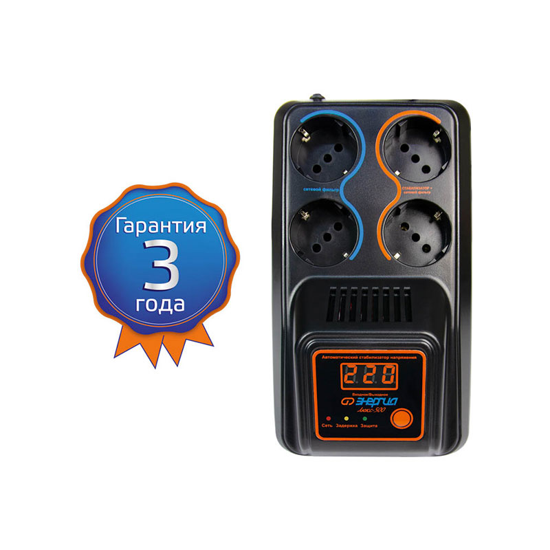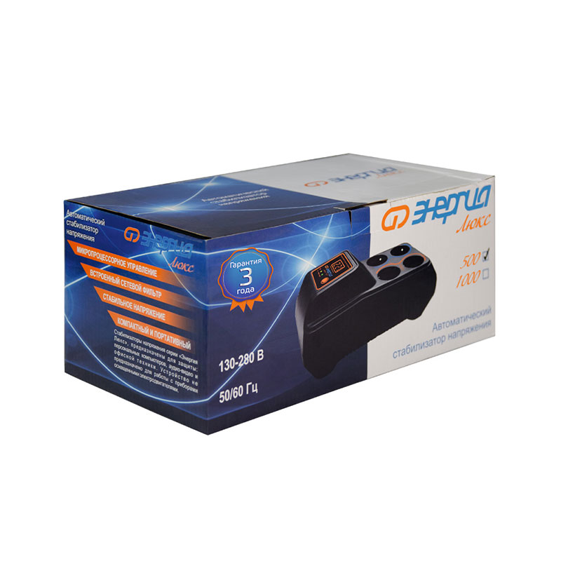 Стабилизатор напряжения «Энергия Люкс» релейного типа обеспечивает защиту бытовой и офисной техники: персональных компьютеров, аудио-видеоаппаратуры, оборудования связи и других устройств небольшой мощности. Модель совмещает функции стабилизатора и сетевого фильтра, оснащена четырьмя евророзетками: две из них работают в режиме «стабилизатор + сетевой фильтр», а две другие — только как сетевой фильтр.
