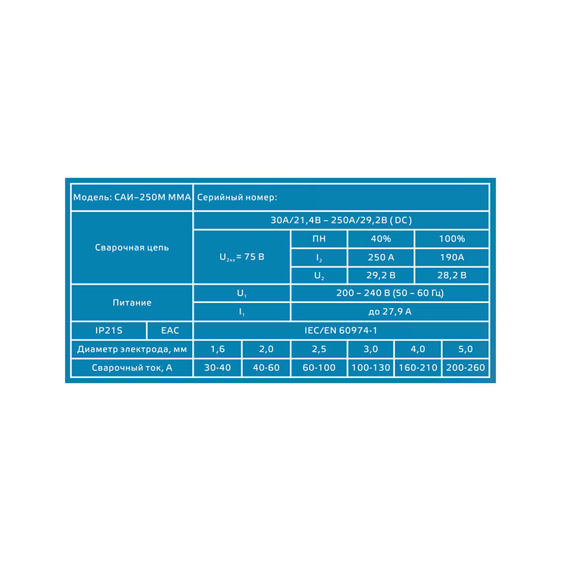 Сила сварочного тока: от 30 до 250А