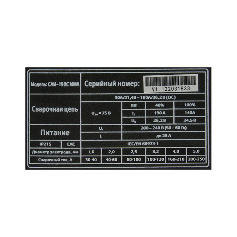 | Длина кабеля держателя электродов, м | 1.6 |