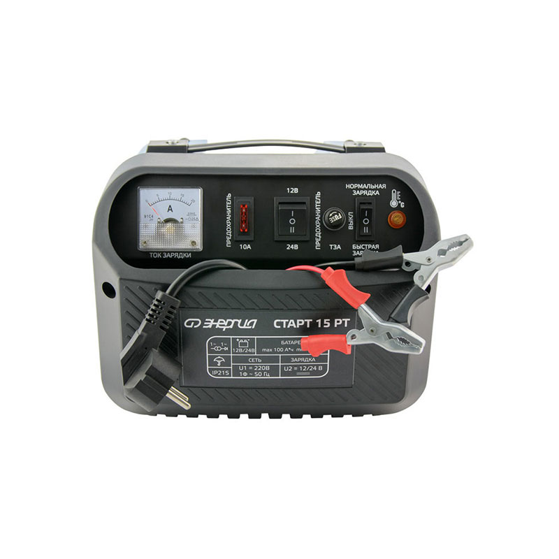 Оно оснащено стрелочным индикатором заряда и двумя режимами работы: быстрым, для срочного восстановления сильно разряженного аккумулятора, и нормальным, для стандартной зарядки. Напряжение заряда переключается вручную на 12 или 24 Вольта.